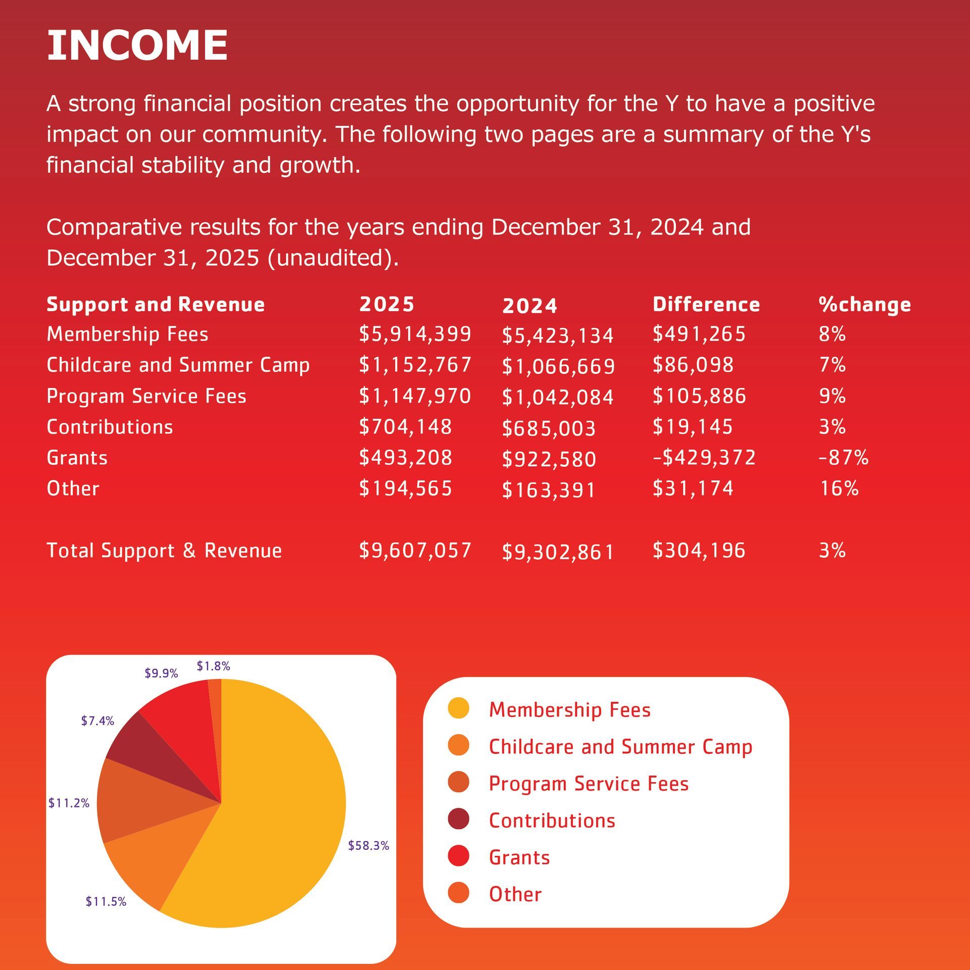 From our founding as a faith-based movement focused on nurturing mind, body, and spirit, the Y has continually evolved to meet the changing needs of those we serve. In 2025, that commitment came to life through expanded access to youth programs, life-changing wellness initiatives, and vital community partnerships that strengthened families and neighbors across our region. Each statistic within these pages represents a story — a child gaining confidence, a senior finding connection, a family discovering stability.